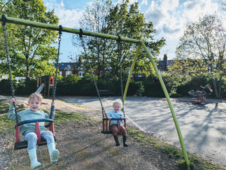 At 5pm we said our goodbyes and cycled to the nearby playground. The boys still had so much energy and the sun was shining so brightly. So we went over to play. George ran to his favourite thing, the swings. They swung together for ages. James soon found a group of friends to join and George found a lost ball to kick around. Matt met us at the park and then we cycled home. We had dinner and then it was off to bed.